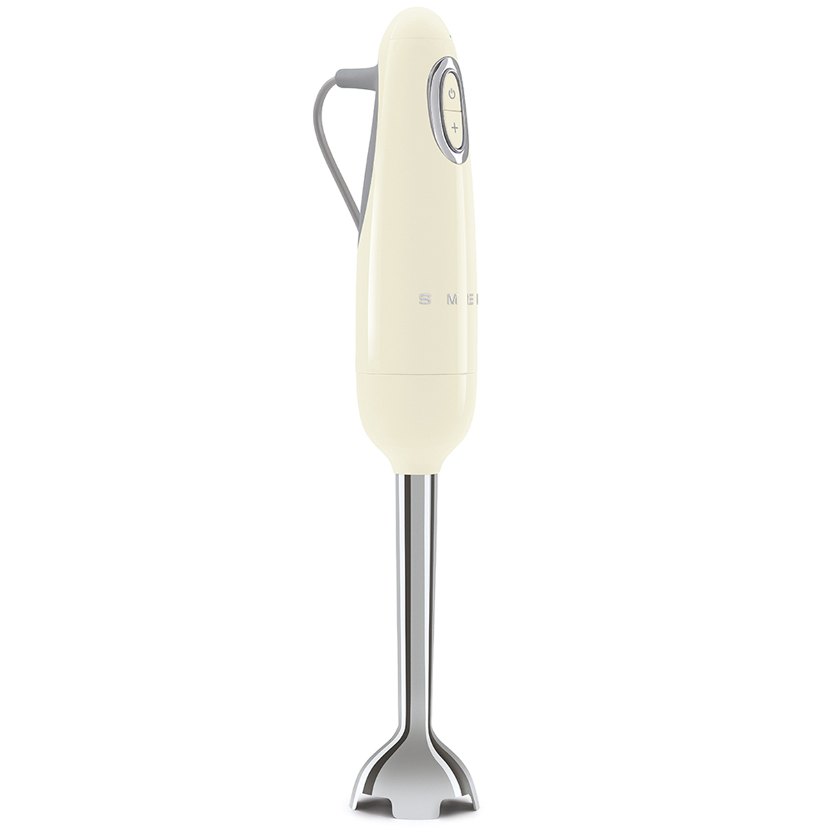 This glossy white hand blender offers modern functionality with a hint of retro-futuristic style. Five speeds plus a turbo function ensure total control over the blended texture, whether you're making chunky chowder, rustic applesauce or silky ganache. Stainless steel blades make short work of ingredients while the ergonomic handle provides a comfortable hold. A trio of accessories expands the functionality of the immersion blender. The wire whisk whips, the chopping bowl transforms the blender into a food processor and the lidded beaker is the ideal blending and storage vessel.